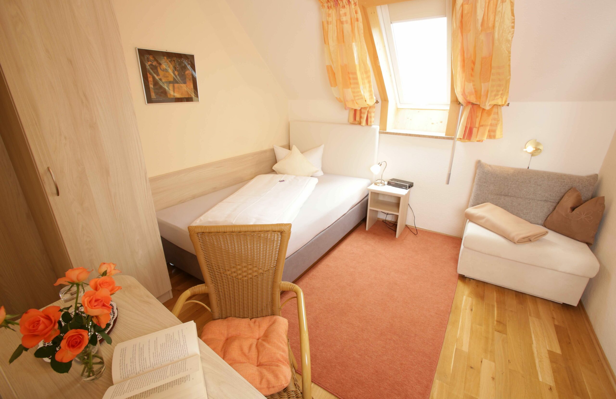 Das gemütlich eingerichtete – ca. 14 m² große – Zimmer für eine Person (Kind ist möglich; Preis auf Anfrage) verfügt über TV und kostenloses WLAN.